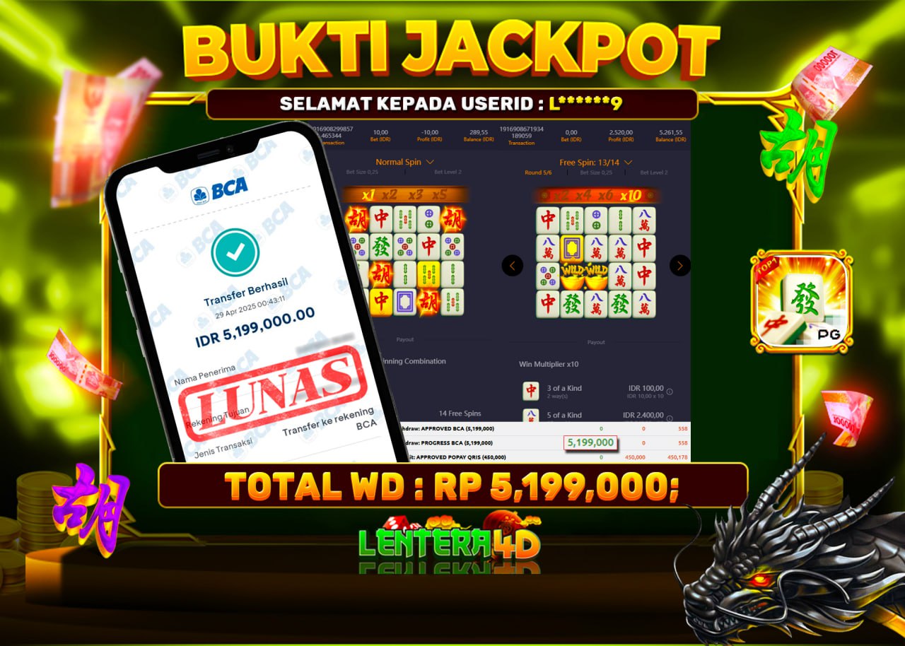Setiap hari, member Lentera4D berhasil meraih jackpot besar dari berbagai provider slot ternama yang kami sediakan, seperti Pragmatic Play, Habanero, PG Soft, dan masih banyak lagi. Kami secara rutin menampilkan bukti screenshot atau rekapan kemenangan yang berhasil diraih, mulai dari kemenangan ratusan ribu hingga puluhan juta rupiah. Semua slip kemenangan ini kami hadirkan untuk membuktikan bahwa di Lentera4D, peluang menang itu nyata.
