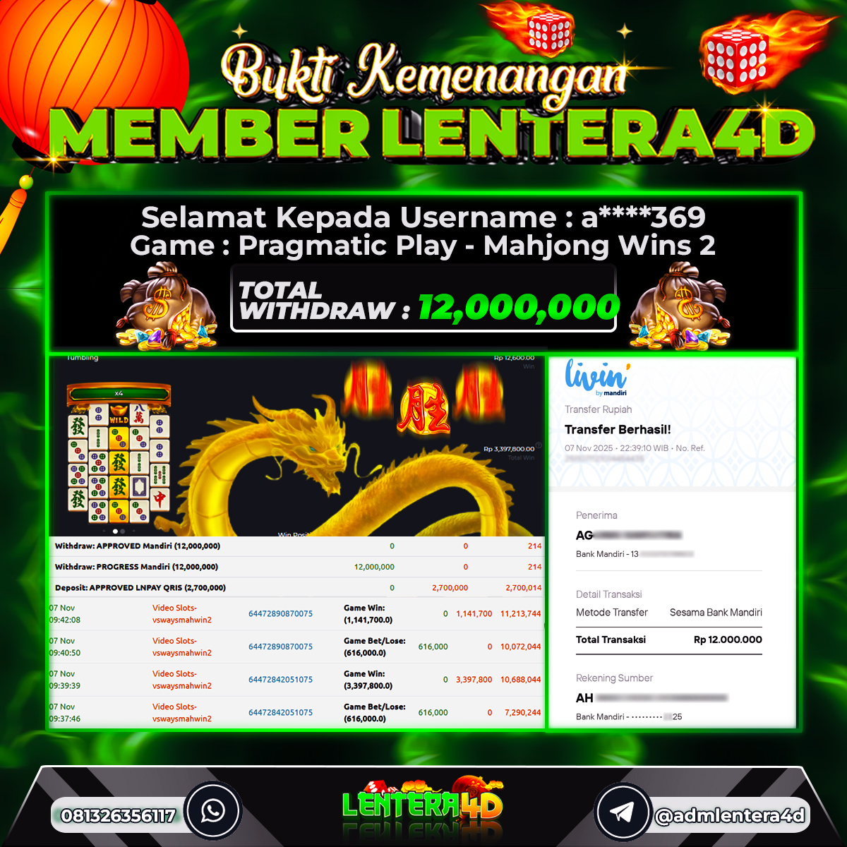 Setiap hari, member Lentera4D berhasil meraih jackpot besar dari berbagai provider slot ternama yang kami sediakan, seperti Pragmatic Play, Habanero, PG Soft, dan masih banyak lagi. Kami secara rutin menampilkan bukti screenshot atau rekapan kemenangan yang berhasil diraih, mulai dari kemenangan ratusan ribu hingga puluhan juta rupiah. Semua slip kemenangan ini kami hadirkan untuk membuktikan bahwa di Lentera4D, peluang menang itu nyata.