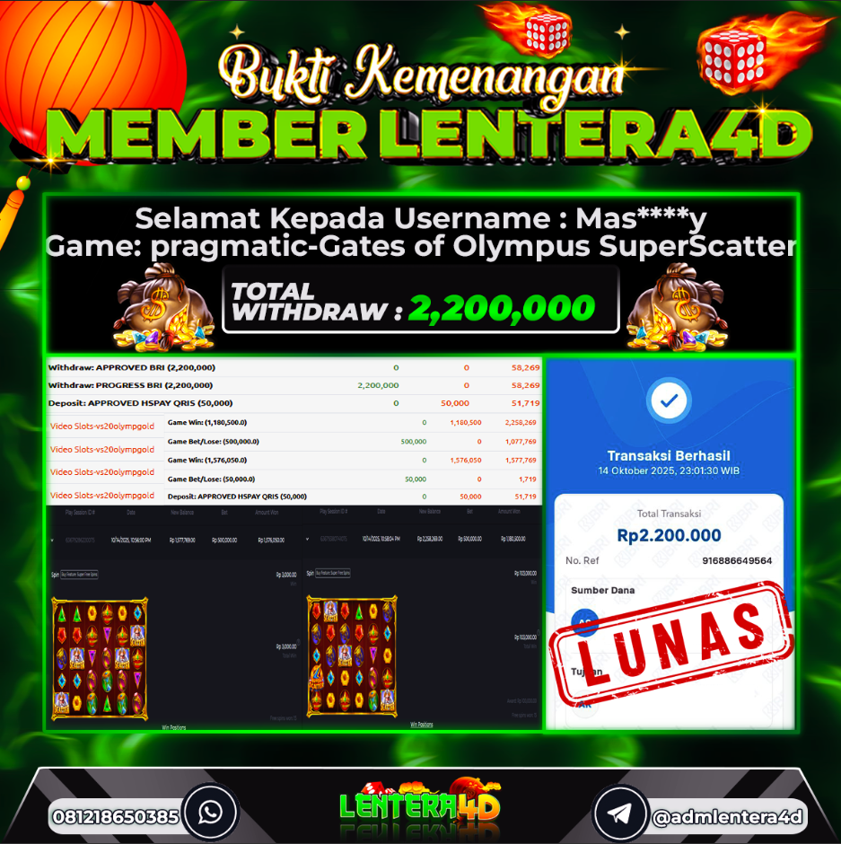 Setiap hari, member Lentera4D berhasil meraih jackpot besar dari berbagai provider slot ternama yang kami sediakan, seperti Pragmatic Play, Habanero, PG Soft, dan masih banyak lagi. Kami secara rutin menampilkan bukti screenshot atau rekapan kemenangan yang berhasil diraih, mulai dari kemenangan ratusan ribu hingga puluhan juta rupiah. Semua slip kemenangan ini kami hadirkan untuk membuktikan bahwa di Lentera4D, peluang menang itu nyata.