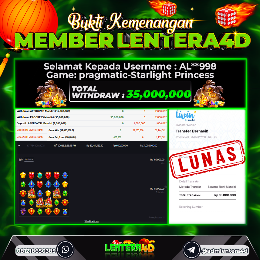Satu lagi Bukti JP dan Pembarayan Sah Dan Dapat Dipertanggung Jawabkan, WD Berapapun Pasti Dibayar Lunas Hanya di Situs LENTERA 4D. Hati Hati Kepada Pihak Pihak Yang Mengatas namakan Pihak LENTERA4D Untuk Melakukan Penipuan.