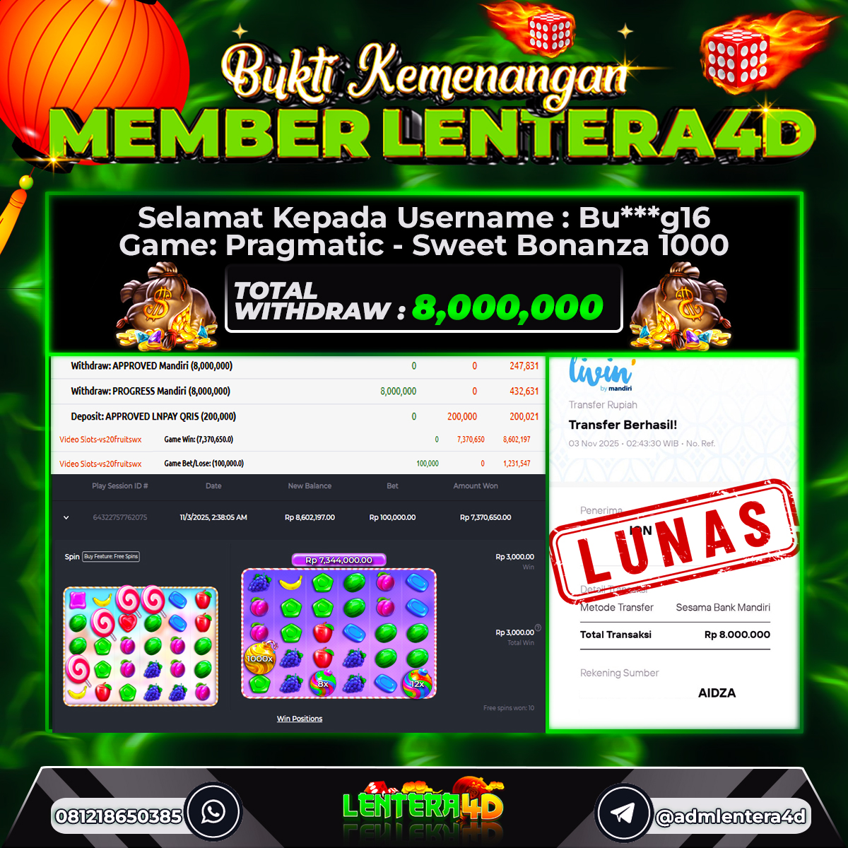 JACKPOT SWEET BONANZA 1000 03 NOVEMBER 2025, Jackpot Slot Gacor, Kemenangan Slot, Bukti Kemenangan Slot, Kemenangan Slot PRAGMATIC PLAY, Menang Slot online, Slot Gacor, Situs Aman Terpercaya, WD Berapapun Pasti DI Bayar Tuntas, Maxwin Slot Online.